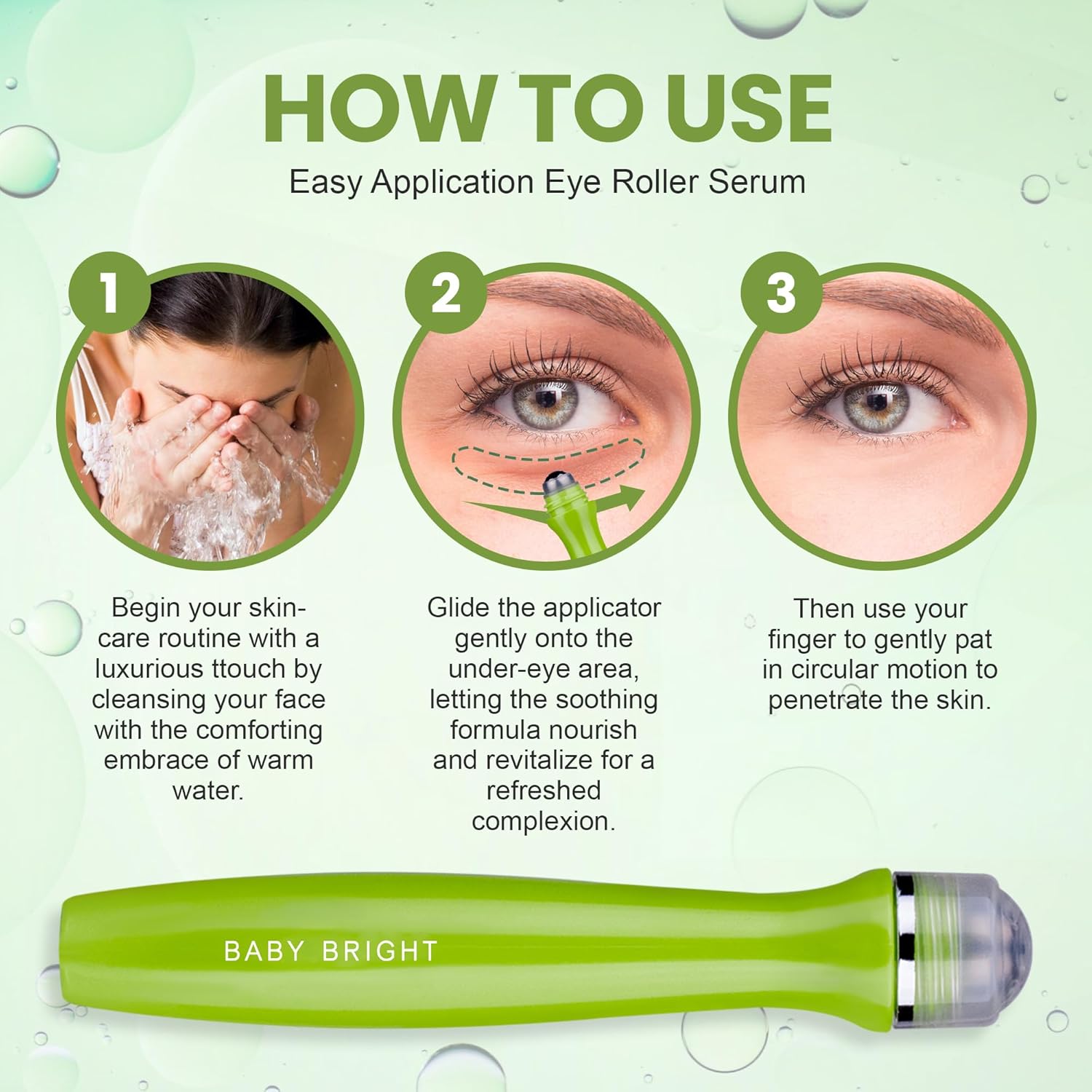 - Nałóż krem przy pomocy metalowego roll-ona, przesuwając kulkę od wewnętrznego do zewnętrznego kącika oka.